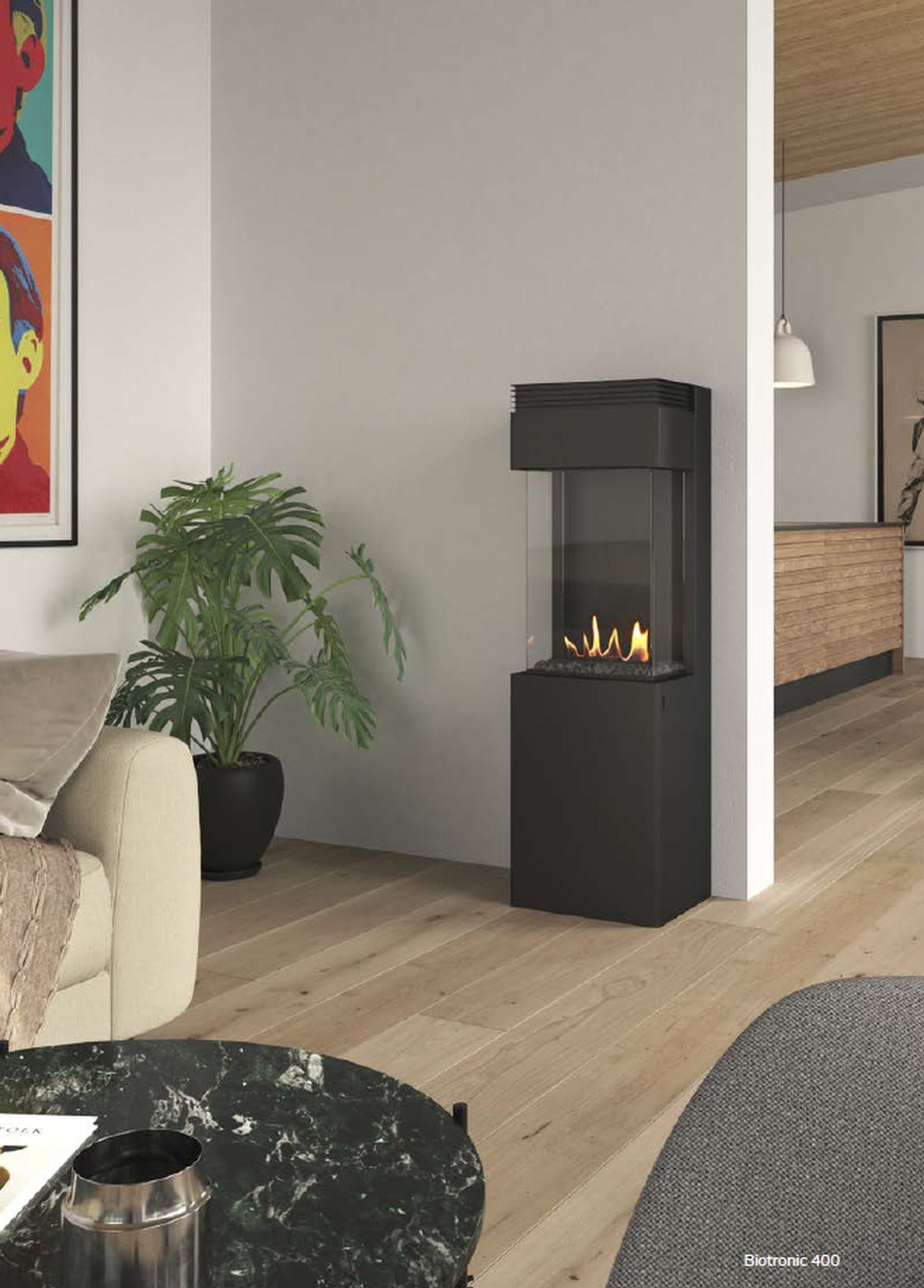 The Biotronic 400 is an automatic bio fireplace that guarantees the highest possible comfort and safety. The technology provides full control over an environmentally friendly, clean, and beautiful fireplace without the use of a chimney. Our bioethanol is made exclusively from natural vegetable by-products, burns almost 100% clean, and emits neither smoke, ash, soot, nor particles.